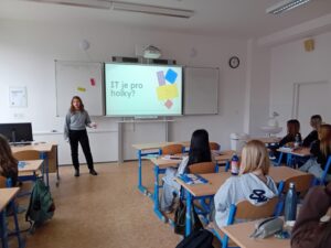 V rámci tohoto projektu dorazila do naší školy paní Anastasiia Lebedenko, aby napomohla bourat stereotypy, že IT je pouze pro kluky a aby zvýšila zájem dívek o IT a digitální obory prostřednictvím inspirace a osobních příkladů úspěšných žen pracujících v oboru.